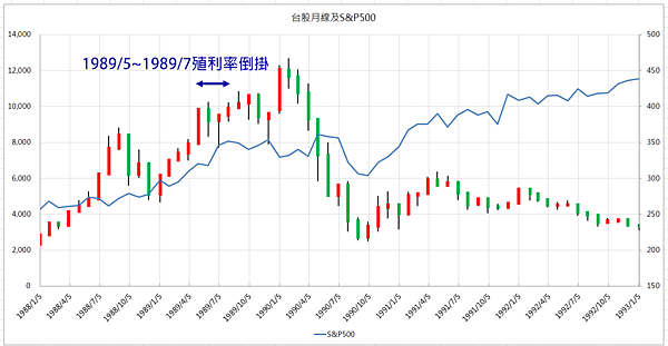1. 1989年及2006年出現倒掛後都還上漲了一段時間,分別是8個月及15個月,漲幅分別為20%及44%。2000年那一次是在倒掛前已經跌了5個月,跌幅為17%