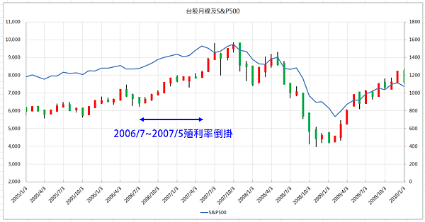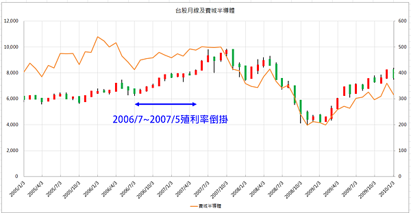 倒掛後台股約15個月後開始起跌,起跌前漲幅約為44%(6727-9680點),起跌後跌幅約為57% (9680-4164點)。